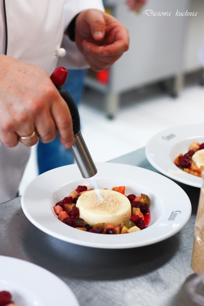 Pomarańczę sparzyć wrzątkiem, zetrzeć z niej skórkę, wycisnąć sok i dodać do garnka.