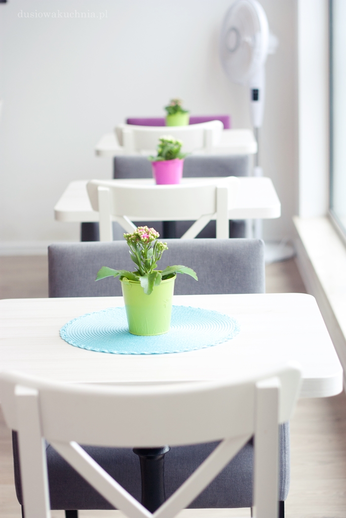 Lokal przykuwa uwagę z zewnątrz wielkimi, szklanymi oknami i wielobarwnym napisem. Wjazd wózkiem z dzieckiem do kawiarni nie sprawi mamom żadnego problemu. W środku dominuje biel, która przełamana jest pastelami, dzięki czemu jest przytulnie.