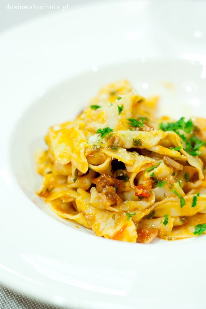tagliatelle all’amatriciana, czyli pastę z suszonym boczkiem, pomidorami pelati, winem, papryczkami chilli i serem pecorino,