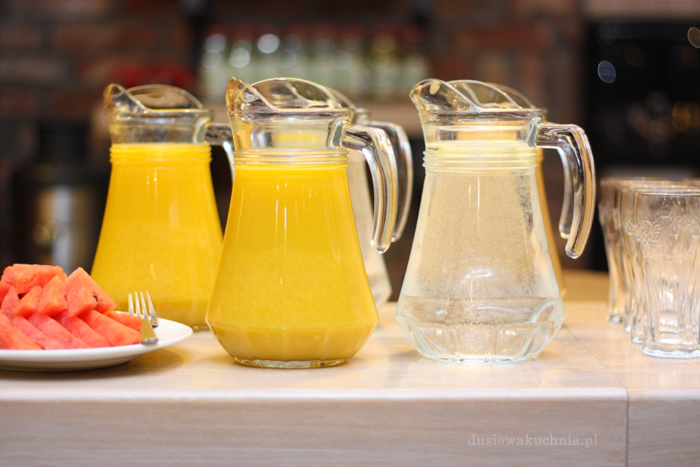 Wśród napojów standardowo owocowe soki, woda, kawa i herbata.