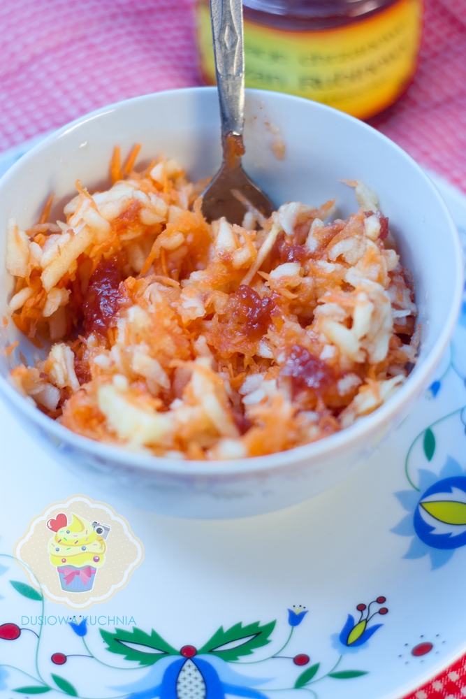 Surówka z marchewki i jabłka, czy ktoś jej nie kojarzy? U mnie w nieco innym wydaniu równie pysznym. Wykorzystałam chrzan rubinowy z czerwoną porzeczką od Specjały spod Strzechy, który wspaniale podkręcił tą prostą surówkę dodając jej nieco charakteru.