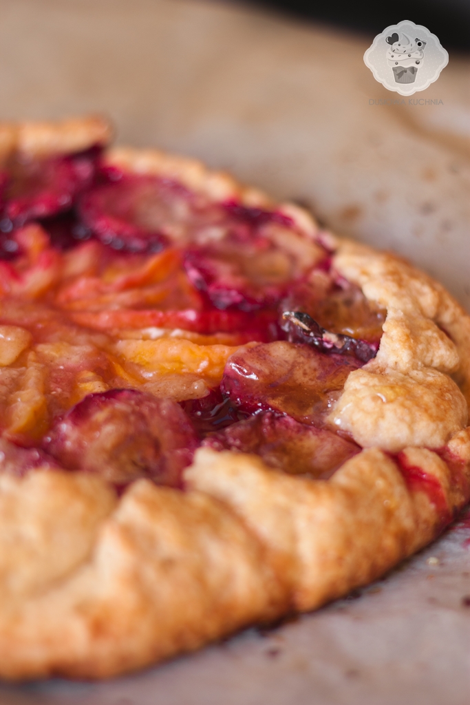 Wyjąć ciasto kruche, rozwałkować na długość blaszki (duża prostokątna).