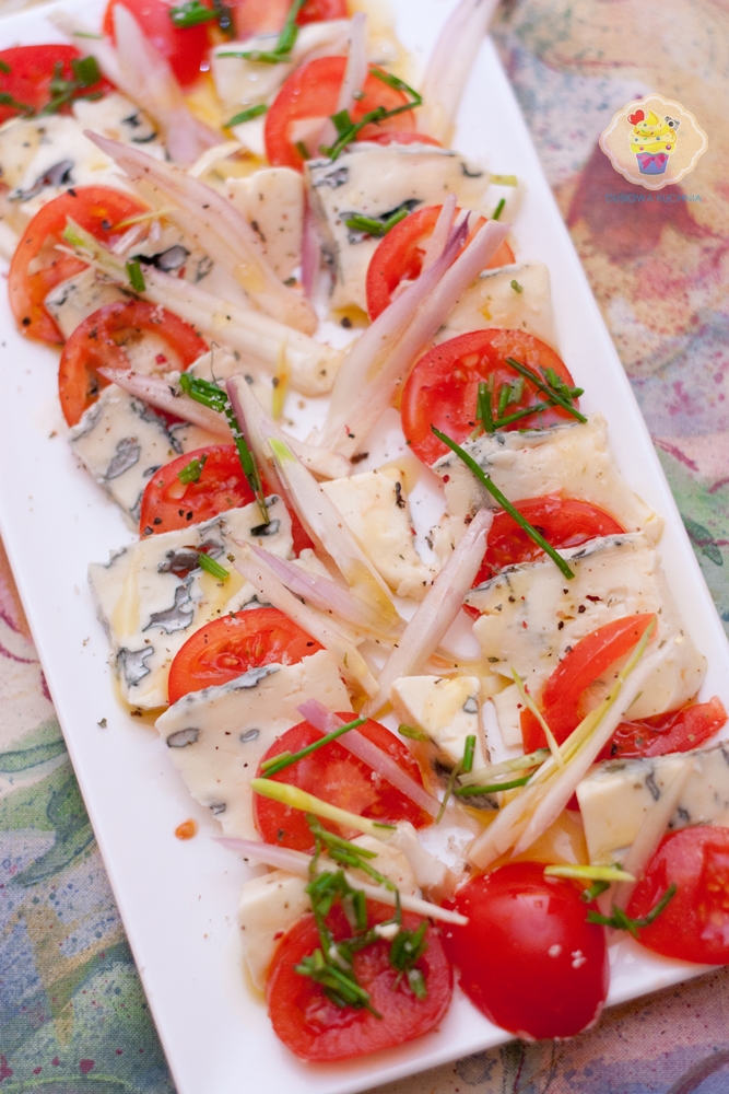 Na talerzu wymieszać warzywa, dodać jajka, porwaną na kawałki mozzarellę i całość polać sosem jogurtowo-czosnkowym.