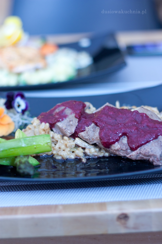 Paweł zdecydował się oczywiście na mięso, a dokładnie pierś z kaczki na grzybowym kaszotto z kaszy pęczak podane z zielonymi szparagami i musem wiśniowo-rozmarynowym (43 zł). Niestety to danie okazało się klęską… nawet wzięliśmy danie na wynos by przekonać się, czy nie przesadzamy i przetestowaliśmy mięso na dodatkowych dwóch osobach, ale nasza negatywna opinia potwierdziła się. Pierś z kaczki nie była różowa, nie miała skórki, była przesuszona i gumowata (podgrzewana?), kompletnie nie doprawiona. Kasza była odrobinę za twarda. Niestety to danie nam nie smakowało.