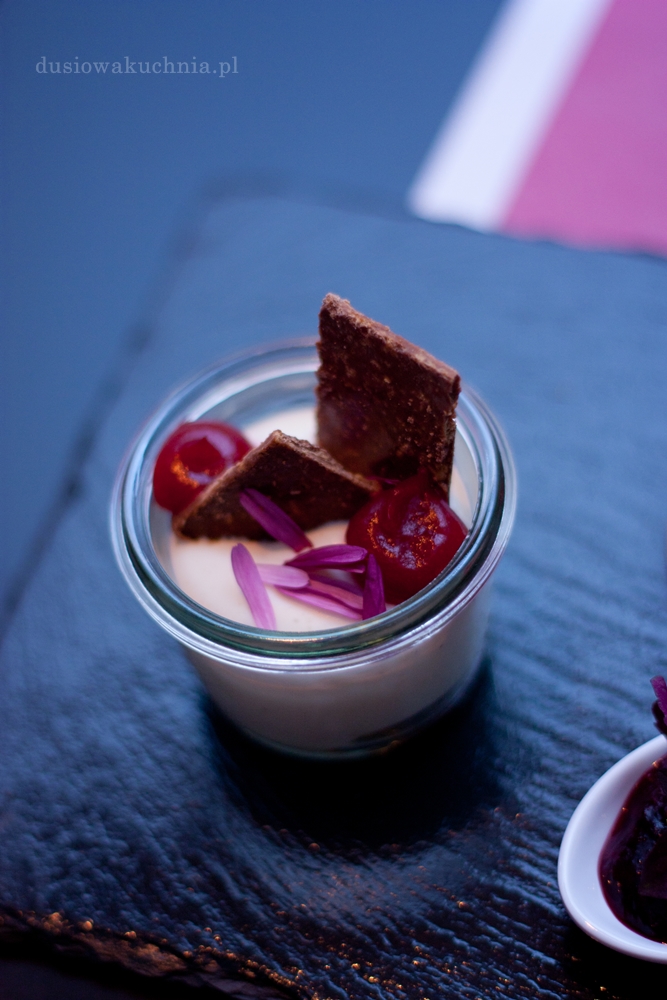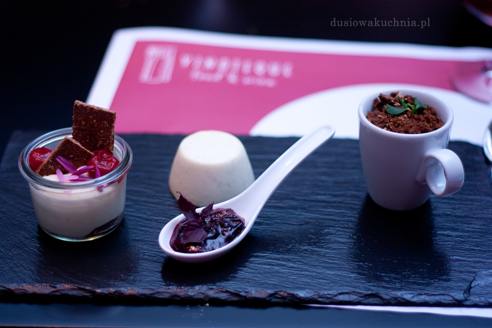 Zwieńczeniem kolacji było trio deserów (25 zł), które przygotowano również z największą dbałością o każdy detal. Na talerzu z kamienia zaserwowano autorskie tiramisu z dodatkiem wina marsala w filiżance do exspresso, panna cotta z konfiturą z owoców lesnych oraz słodko-słony sernik na bazie ricotty z karmelizowanymi orzeszkami pinii.