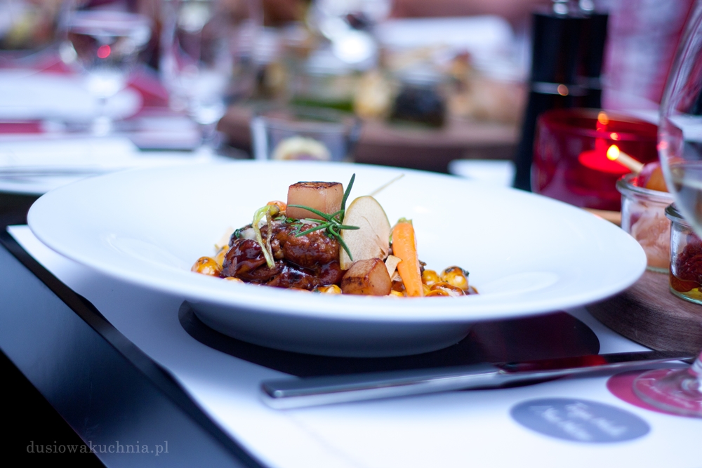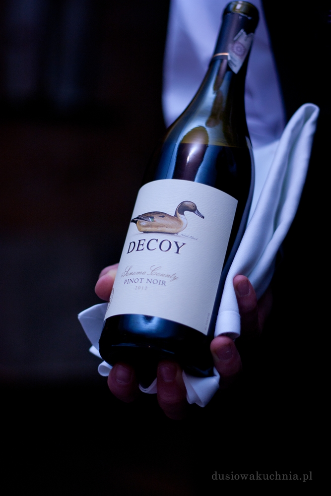 Wśród dań głównych do wyboru był królik duszony w czerwonym winie (65 zł) z jabłkami w tymiankiem i mini gnocchi podany na sosie demi-glace. Danie to zostało podkreślone wyrazistym winem Decoy Sonoma County Pinot Noir 2012.