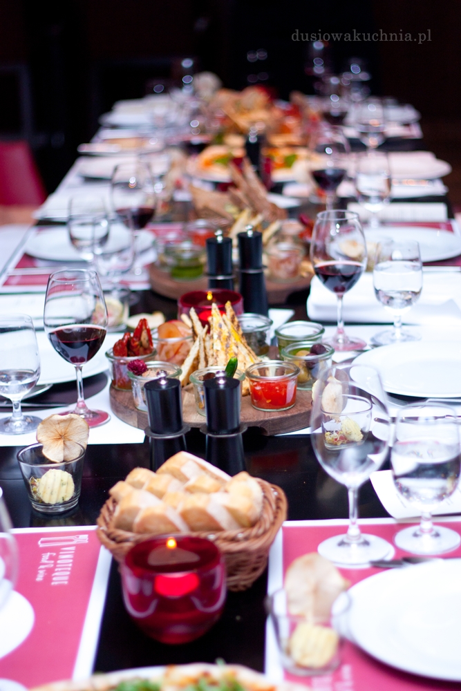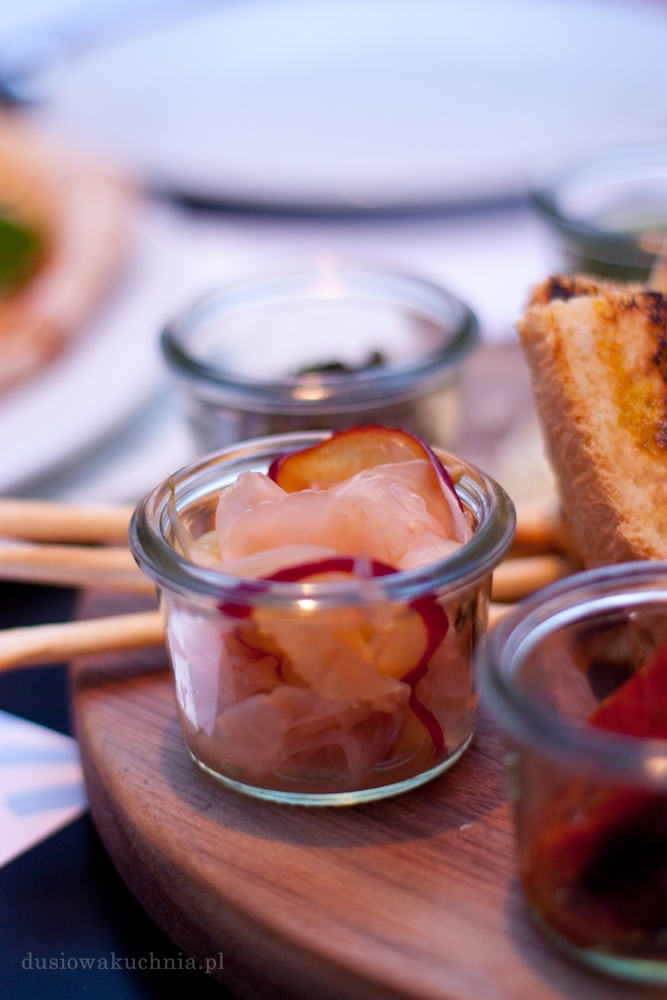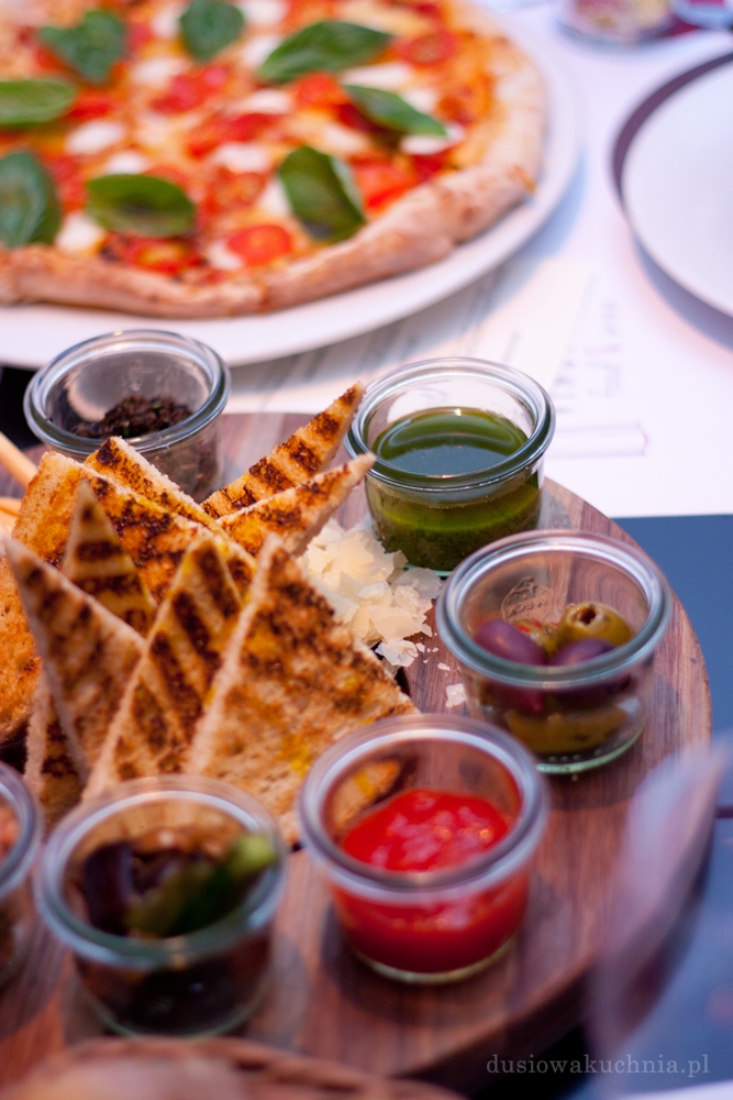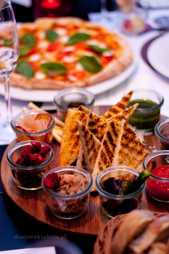 Na przystawkę mieliśmy okazję spróbować zestawu Antipasti (40 zł). W tej krótkiej nazwie ukryło się bogactwo przekąsek, czyli. bruschetty z dodatkami w słoikach i na desce (oliwki, pasta z oliwek, pesto, pasta z tuńczyka, parmezan, suszone pomidory, pikantna salsa pomidorowa, grillowane warzywa, fenkuł ze śliwką).