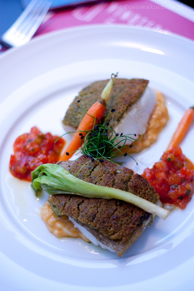 Dla mnie najpyszniejszym daniem, które na długo pozostanie w pamięci okazał się halibut z chrupiącą posypką podany na risotto rakowym z młodą marchewką i pomidorową salsą (55 zł). Po prostu istny raj dla kubków smakowych. Chrupiący wierzch z niezwykle delikatnym i soczystym mięsem halibuta idealnie zgrał się z kremowym risotto.