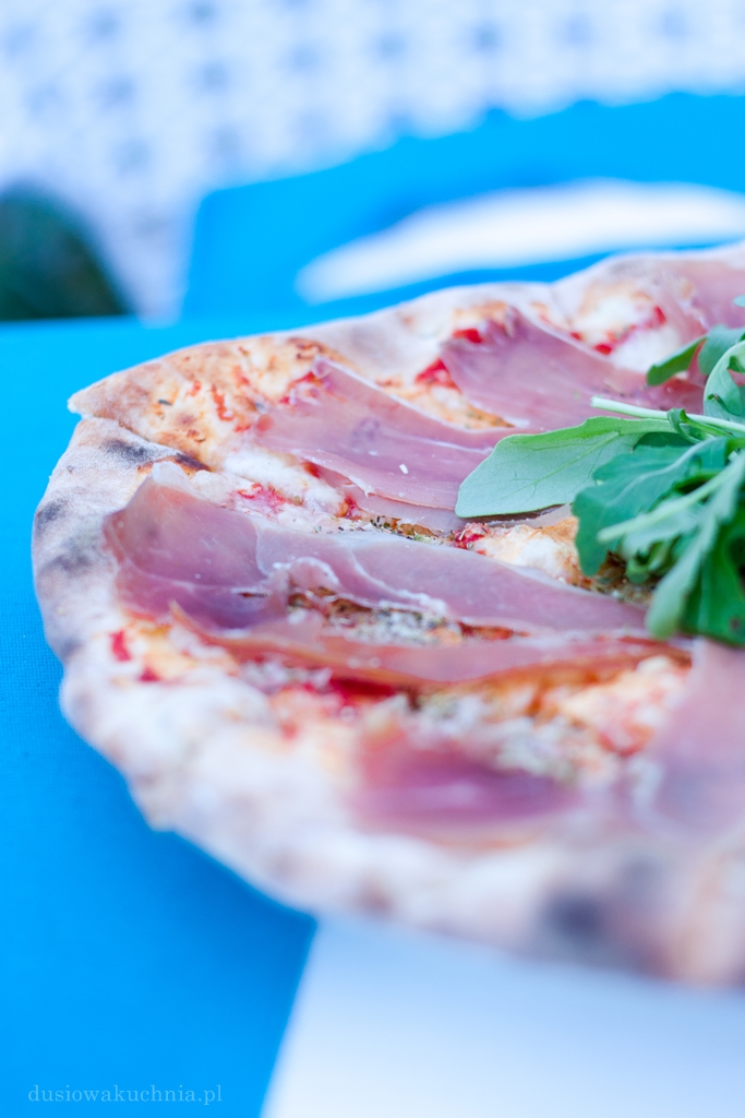 Pizza była typowo włoska – cienkie i chrupiące ciasto z domowym sosem pomidorowym, dużą ilością sera i bez oszczędności na szynce. Na pizzy były pokaźne plasterki, tak jak lubimy. Na środku znalazła się rukola, która idealnie tu pasowała. To była naprawdę pyszna pizza.