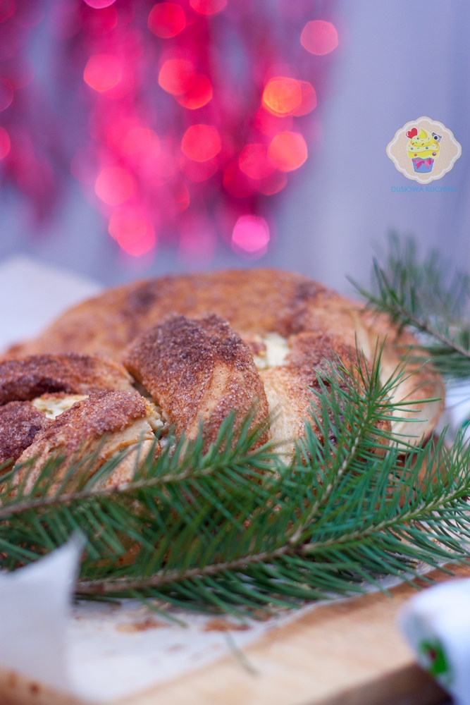 Ciasto rozwałkować na duży prostokąt – posmarować masłem i posypać cukrem cynamonowym.