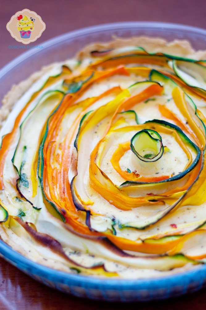 Rzadko robię tarty, średnio przepadam za robieniem kruchego ciasta, wylepiania nim formy, ale taka zakręcona tarta chodziła za mną już dłuższy czas, dlatego przy nadarzającej się imprezie postanowiłam ją zrobić. Lubię cukinię w takich wypiekach właśnie, żółta i zielona, a do tego pomarańczowy kolor z marchwi, można by jeszcze dodać bakłażan. Z sosem czosnkowym smakuje dobrze na zimno i na ciepło, nawet na kolejny dzień, bo można taką tartę podgrzać. Z wytrawnych tart polecam także: