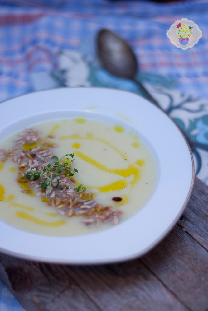 Zmiksować zupę przy użyciu blendera, doprawić do smaku solą (około 1,5 łyżeczki), pieprzem i szczyptą gałki muszkatołowej.